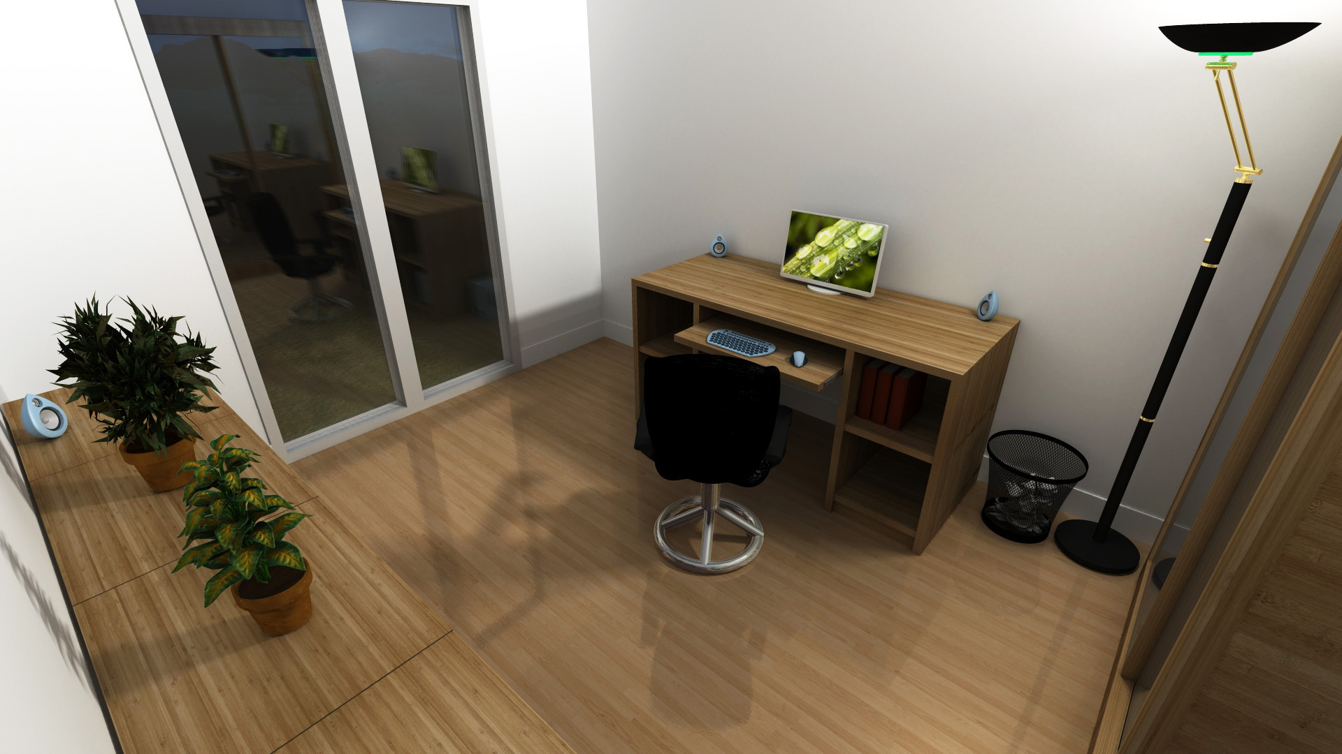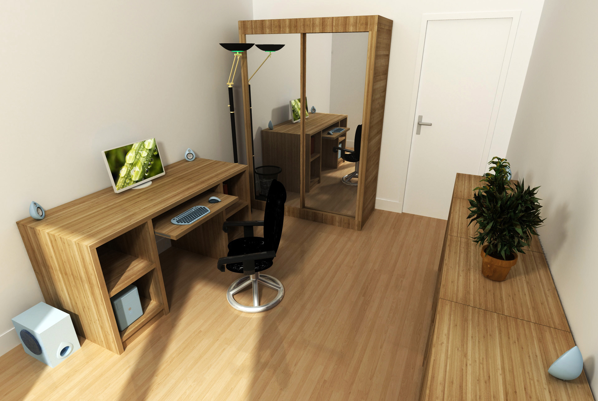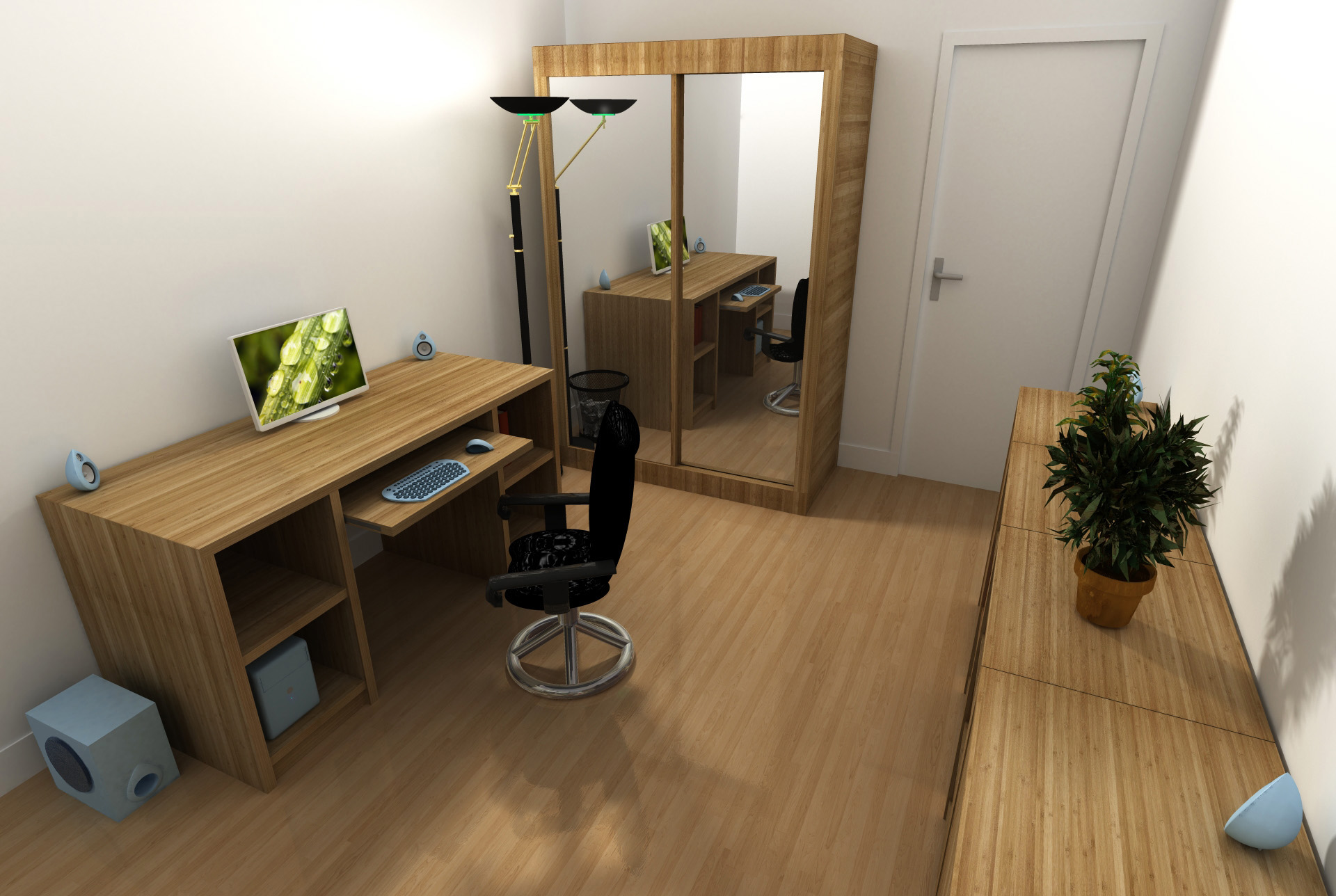 Premier projet réalisé sur 3ds max en 2012, pour appendre à utiliser ce logiciel qui permet plus de possibilités en termes de modélisation, réalisme du rendu, d'application de textures,... Cette dernière a été réalisée en scannant une planche de bambou, et déployée afin de respecter la coupe longitudinale ou transversale des fibres.